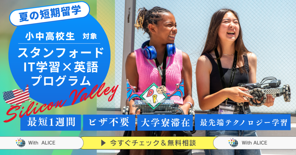 アメリカ留学・研修を通じて本当の成長を実感しませんか?シリコンバレーを舞台に、スタンフォード大学STEAMキャンプやターム留学、インターンシップなど、価値ある経験を提供。国際教育プログラム実施20年の実績と、信頼のサポート体制で、人生を変える挑戦を支援します。あなたの可能性を広げる第一歩をここから始めましょう。